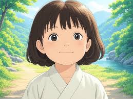 a portrait of a smiling young woman with short black hair, in Studio Ghibli anime style, soft warm lighting, peaceful forest background, gentle and dreamy mood